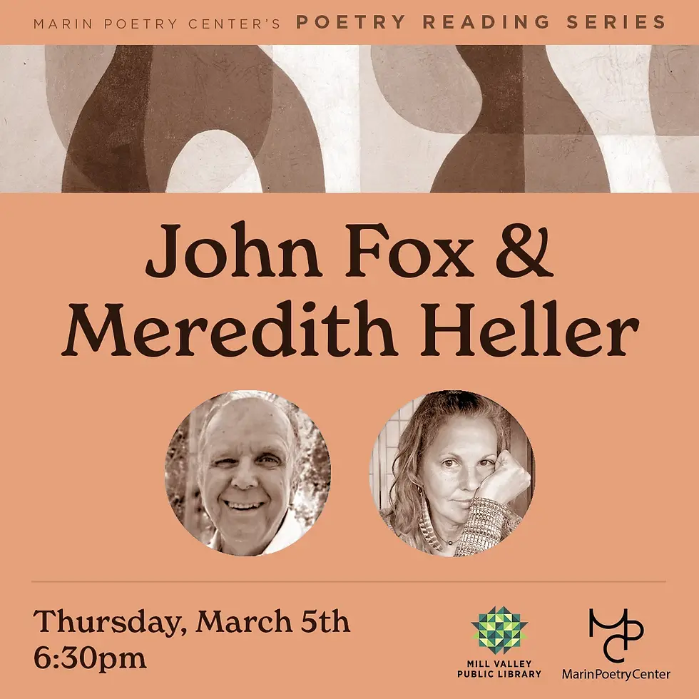 Thursday, March 5th from 6:30 p.m. to 8:00 p.m. PT the Mill Valley Poetry Center Library is sponsoring a Poetry Reading by myself and Meredith Heller.